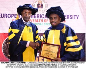 In recognition of his series of impressive achievements, especially in the area of human capacity development, and service to humanity, the Academic and Award Committee of European American University, Republic of Panama, on Saturday, 29th of March, 2025, conferred on him Doctor of Science (Dsc) Degree in Entrepreneurship, International Business Management and Corporate Governance honoris causa, with all rights and privileges. Mbamalu received the honour