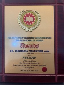 DR. MBAMALU INDUCTED AS FELLOW OF THE INSTITUTE OF CHARTERED ADMINISTRATORS AND RESEARCHERS OF NIGERIA