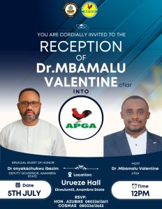 Dr. Mbamalu’s passion to serve humanity has inspired his recent decision to venture into politics, and arrangement for his grand reception into the All Progressives Grand Alliance (APGA) has been concluded. And the milestone event will take place on the 5th of July, 2025, right in his home town, Urueze, Ekwulumili, Nnewi South Local Government of Anambra State.