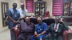 (Standing left: Dr. Azeez Abayomi Mustapha, Managing Principal of AZ De World Cargo Logistics Limited, the Secretary General of NAGAFF, Comrade Emeka Godfrey Nwosu, HRM, Eze Amb. Damian Emeka Obianigwe KSM JP, the PG of ASIMPIN, the Chief of Staff to the PG, High Chief Law Uba, and the National Secretary of ASIMPIN, Prince Okey Egbuchulam during the courtesy visit )