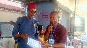 The Electoral Committee Chairman, Mr Gideon Nwagbaraocha (right)presenting a certificate of return to the Chairman Elect, Chief (Dr) P.C. Shedrach.
